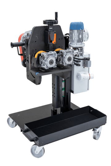 The beveling machine is mobile, with its own chassis, enabling it to move along the material and be easily relocated between workstations. The working height of the machine can be adjusted within a range of 804 to 1,054 mm. Once initially guided onto the plate, the beveling machine is equipped with an automatic feed system under the supervision of the operator. For smaller pieces of material, the beveling machine can independently feed and bevel without the need for physical exertion from the operator.