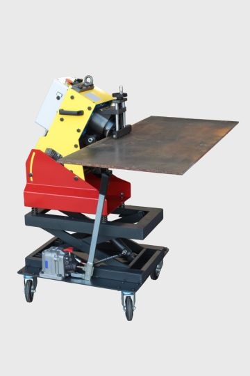 Another version of the machine is SPEDANGLE with a rotator. When using the rotator, a single machine can be used for beveling the upper and then the lower side of the plate, and the working height of the machine can also be adjusted.