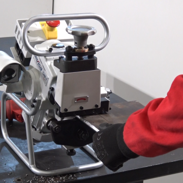 The principle is based on a special rotary tool that shears off a narrow strip of material while simultaneously creating the required bevel angle. Instead of fine chips as in milling, a continuous metal strip is produced, which is easy to remove. The edge is not heated or deformed, and no burrs are formed, so it is immediately ready for welding.