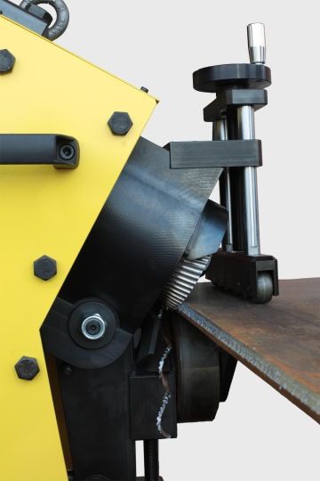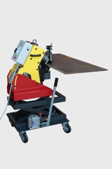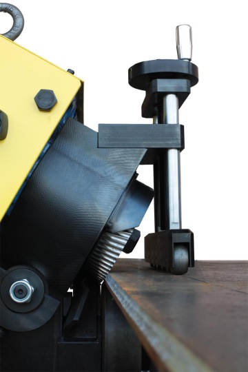 SPEDANGLE ist ein Schweisskantenformer, der mit einem selbstgreifenden Schersystem arbeitet und sowohl große Bleche als auch kleinere Werkstücke mit einem rotierenden Scherenwerkzeug abkanten kann. SPEDANGLE kann Platten Blechstärken von 6 - 40 mm und mit einem Fasenwinkel von 22.5° - 30° - 37.5° - 45° - 55° anfasen. Die Fasenwinkeleinstellung ist einfach und schnell, ohne zusätzliches Zubehör. Die maximale Fasenbreite beträgt 18 mm bei Kohlenstoffstahl und 15 mm bei Edelstahl und ist auch vom Fasenwinkel abhängig.