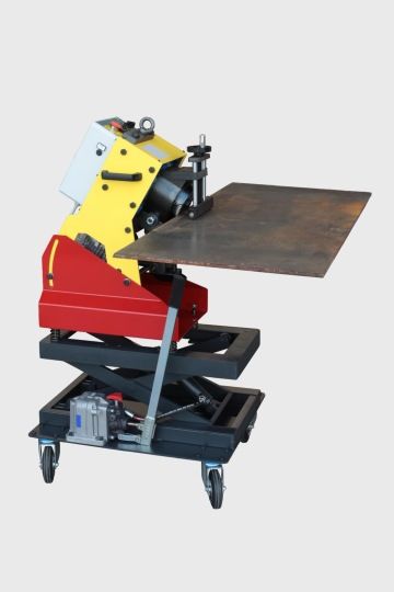 Die Maschine wird mit Räder geliefert, um die Manipulation zu erleichtern, oder es kann ein optionaler hydraulischer Wagen erworben werden, der in der Höhe verstellbar ist. Die Maschine verfügt über ein System mit zwei Geschwindigkeiten. Sie kann mit einer Geschwindigkeit von 1,5 m/min oder 3,0 m/min abkanten. SPEDANGLE kann Blechkante mit konvexen Radien R>1.000 mm und konkaven Radien R>5.000 mm abkanten. Für das Anfasen von Rohren ist kein spezielles Zubehör erforderlich. Der minimale Innendurchmesser der Rohre beträgt 125 mm.