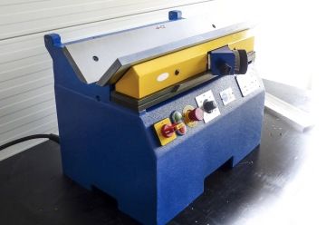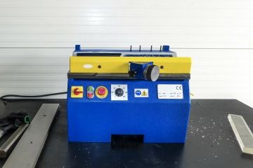 Die Tischkantenfräsmaschine VEERIO wurde für das Kantenfräsen von geraden Kanten kleiner Bleche entwickelt. Sie arbeitet nach dem Fräsprinzip mit einem rotierenden Fräskopf, der mit 7 vierseitigen Hartmetall-Wendeschneidplatten bestückt ist und Kanten bis zu einer Breite von 10 mm unter einem 45°-Winkel anfasen kann. Eine V-förmige Führungsschiene garantiert eine exakte Ausrichtung des Blechs an der Kantenfräsmaschine.